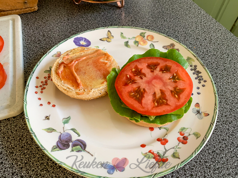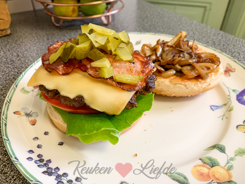 - Broodjes besmeren met mayo, ketchup en mosterd en beleggen met sla, tomaat, burger, bacon, augurk en gebakken uien