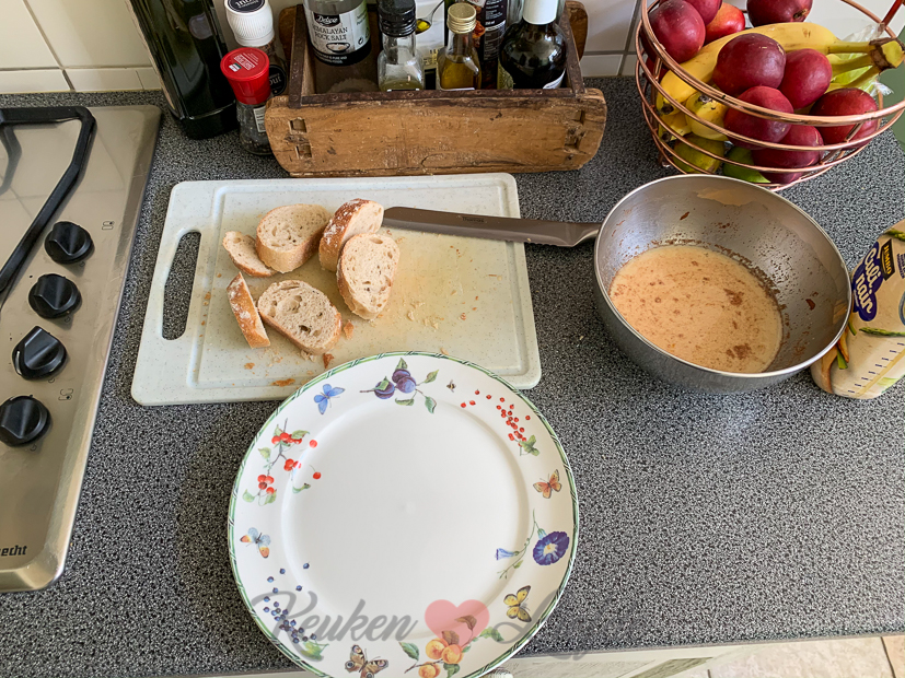 Ik heb nog een stokbrood liggen waarmee je inmiddels een krater in een pakje boter kunt slaan. Met een versgeslepen broodmes lukt het me nog net om er plakjes van te snijden. Wentelteefjes tijd!