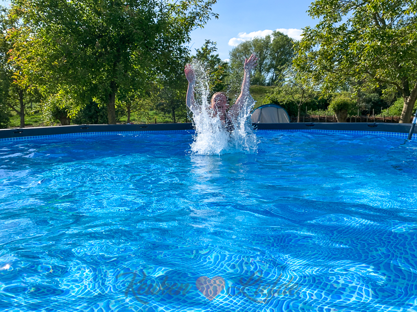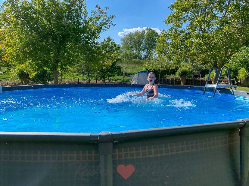 Aan het eind van de middag is het eindelijk warm genoeg om voor de eerste keer in het zwembad te plonzen! Het water is nog wel erg koud, maar Ella-Marie houdt zich groot. ?