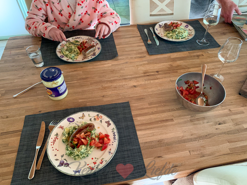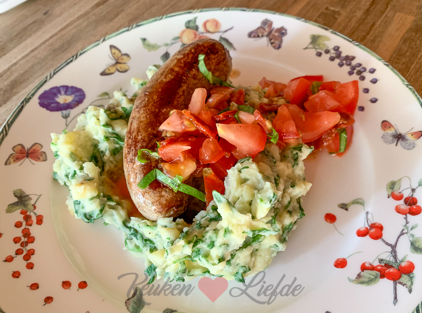 Als het ’s avonds afkoelt ruimen we buiten de boel op en gaan we naar binnen om eten te koken. In het verspakket dat ik kreeg van GRO zitten alle ingrediënten voor een zomerse rucola stamppot met gebakken Blended worst en zelfgemaakte tomatensalsa. Makkelijk om te maken en snel klaar dus dat wordt het vanavond! Zowel de worst als het gerecht zelf waren erg lekker!