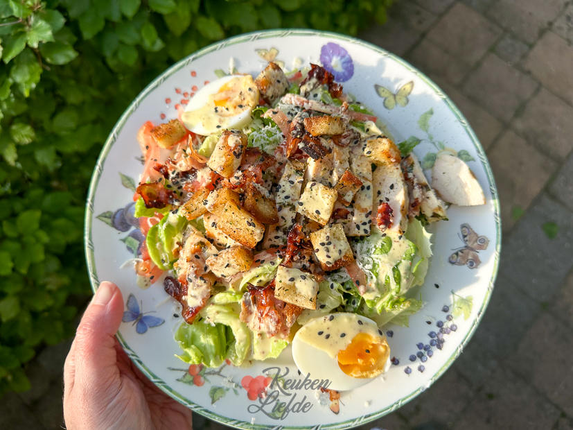 We vermaken ons weer de hele dag rondom huis. Er wordt hard gewerkt in de tuin en de tuinmeubels worden schoongemaakt. ’s Avonds gaat het ei aan. Terwijl ik binnen een kropsla schoonmaak, wat eitjes hard kook en sladressing maak (mosterd, ansjovis, citroensap, parmezaan, knoflook, zoetzuur augurkennat, olijfolie, water en mayonaise; hoeveelheden op gevoel in de blender mixen tot dressing) steekt Johan buiten het ei aan. Hij bakt bacon in de skillet, daarna bakt hij de broodcroutons (in blokjes gesneden oud brood omgehusseld met olijfolie, een geplette knoflookteen, wat gedroogde kruiden en een snuf zout) in het bakvet van de bacon en daarna wordt de gemarineerde kip (olijfolie, geperste knoflook, klein beetje citroenrasp, gehakte peterselie, gedroogde dille, oregano en zout en peper) gegrild. Meng de sla met een beetje dressing en verdeel over de borden. Rasp er parmezaan overheen en verdeel de rest van de ingrediënten erover. Het lijkt op dit recept.