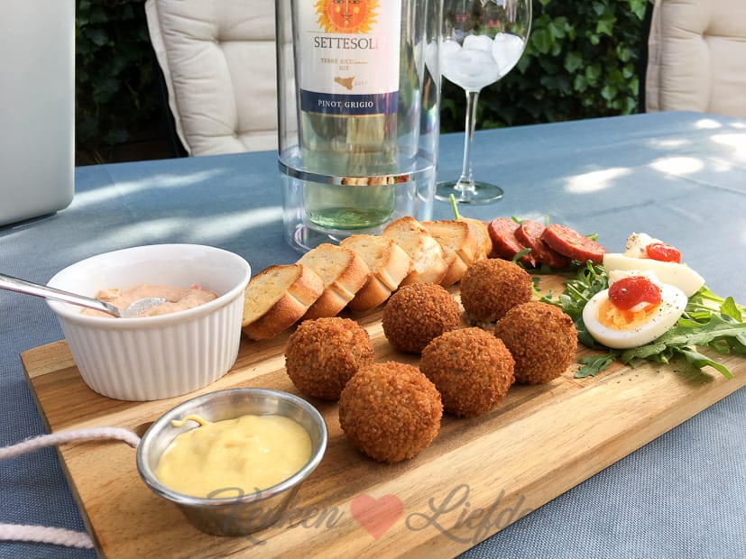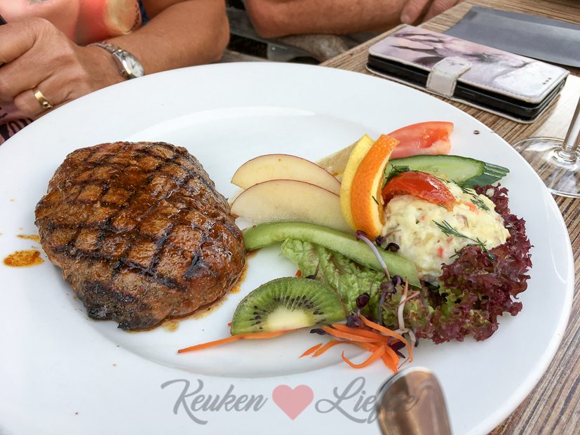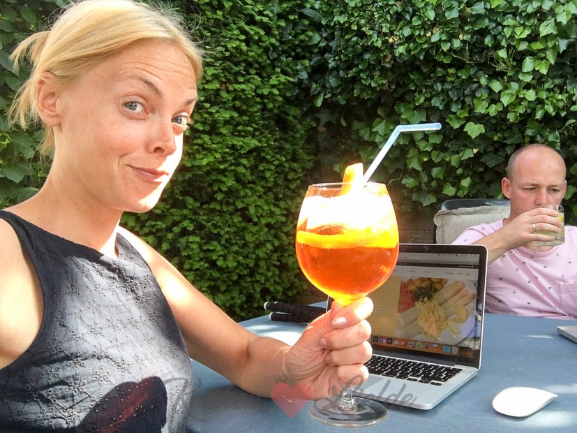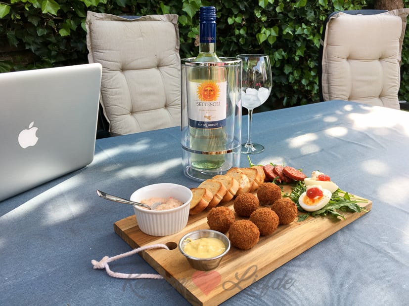 Ondertussen als ik foto’s van de gerechten maak heeft Johan buiten alles schoongemaakt, de parasol opgezet en de kussens in de stoelen gelegd. Tijd voor een hapje en drankje!