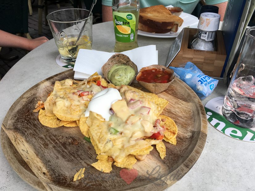 Ella-Marie is gisteren bij Johan zijn ouders blijven slapen. Aan het eind van de ochtend stappen Johan en ik op de fiets om haar weer op te halen. Daarna gaan we met z’n drieën even lunchen op het terras bij restaurant De Merckt. Johan eet een tosti en Ella en ik delen nacho’s met kaas. 🙂