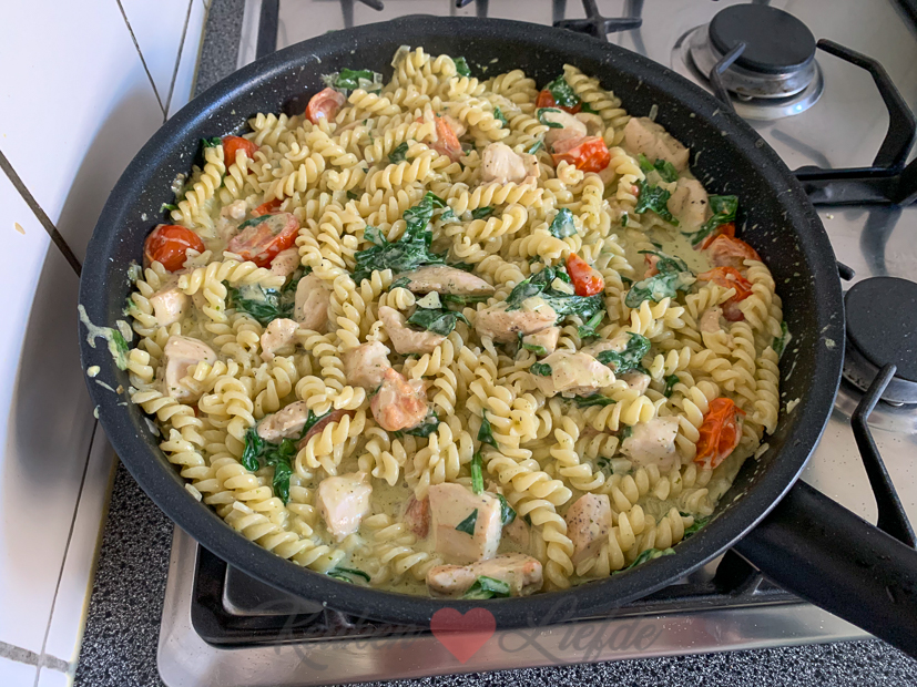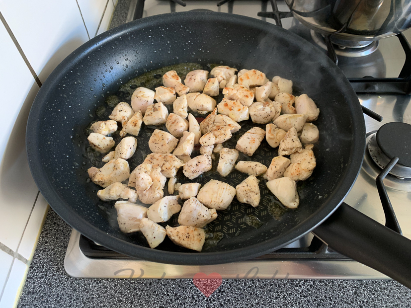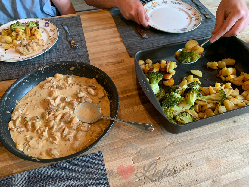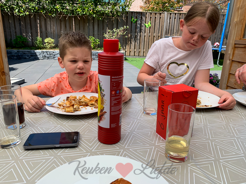 Helaas is het ’s avonds niet warm genoeg om buiten te eten. Geeft niks, binnen is het ook gezellig. Ik maak pasta pesto met kip (gezinsfavoriet! Ongeveer dit recept maar dan met kip) en die eten we met het bord op schoot voor de tv. Tegenwoordig vaste prik op zaterdagavond.