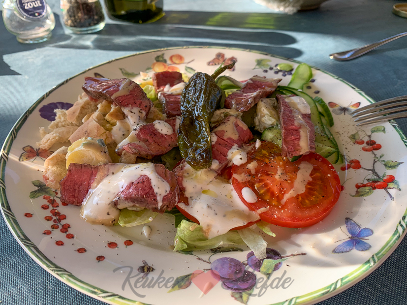 ’s Avonds slingeren we de barbecue aan. We eten een lekkere salade met pitabrood en gegrilde biefstuk en Pimientos de Padrón pepers. Ook de aardappelsalade die ik van de week maakte komt op tafel.