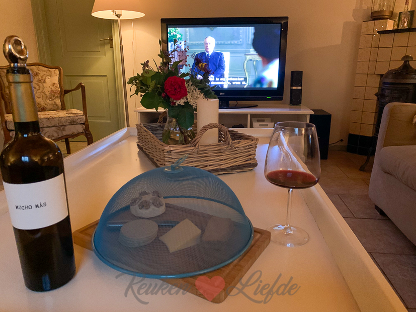 Als Ella-Marie op bed ligt genieten Johan en ik nog van een kaasje met een glas rode wijn en een aflevering van de Netflix-serie The Crown. Goede serie!