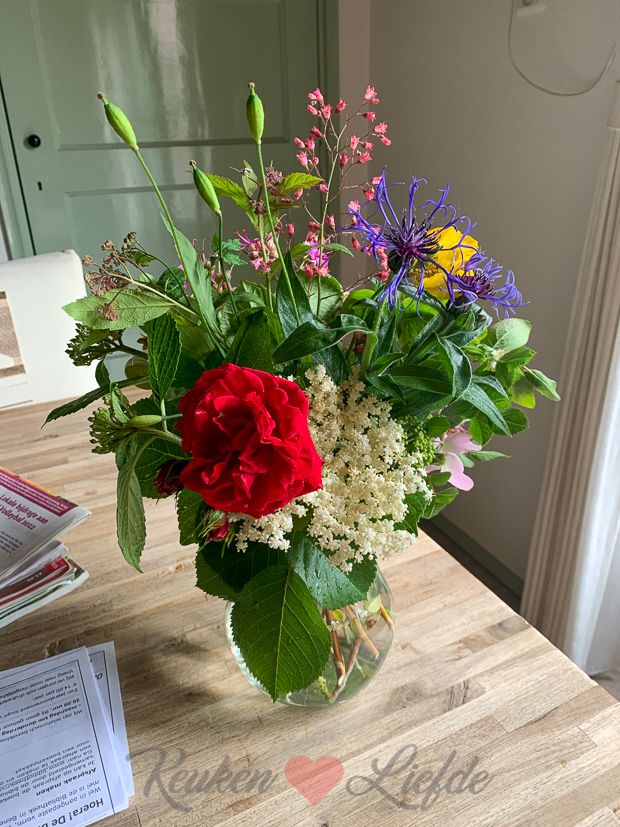 Ella-Marie heeft aan het eind van de ochtend voetbaltraining. Johan werkt in de tuin en ik werk een paar uurtjes op kantoor. ’s Middags komen Johan zijn ouders nog even langs met wat lekkers van de bakker en Ella-Marie speelt met een vriendinnetje. De meiden mochten bij het vriendinnetje in de tuin bloemen plukken voor een boeketje en die hadden ze voor me meegenomen. Hoe leuk is dat! Er gaat niks boven een boeket uit eigen tuin!