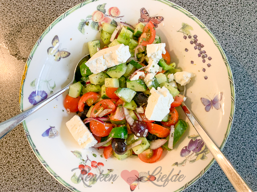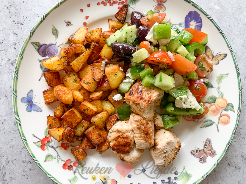 Vandaag weer een gewone werkdag. Ella-Marie en Johan zijn de deur uit en ik ben thuis. In de ochtend zit ik op kantoor en ga ik even naar de winkel om boodschappen te doen. ’s Middags maak ik een campagnerecept dat binnenkort online komt en werk die uit. Voor het avondeten bak ik wat aardappels en kip en serveer die met een Griekse salade.
