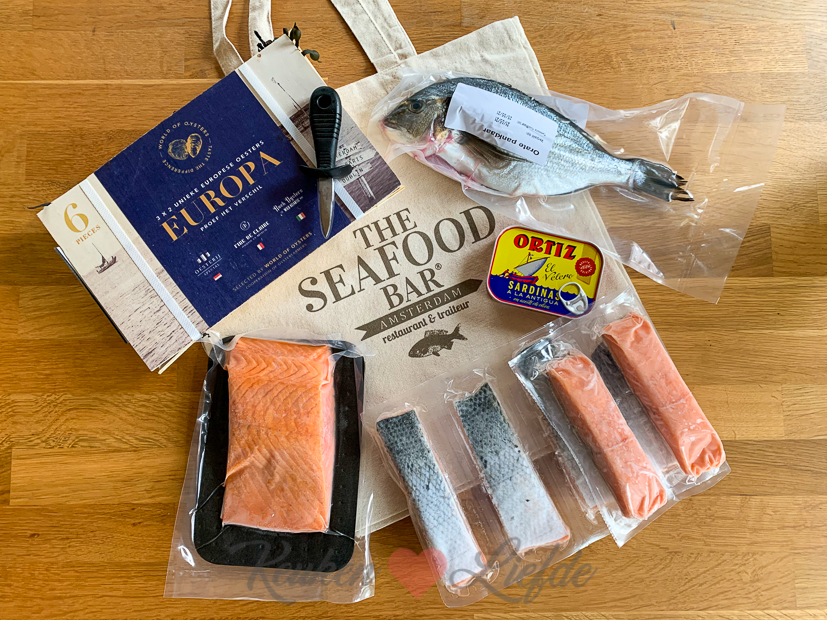 Verder kregen we nog een pakketje thuisbezorgd met verse vis van The Seafood Bar in Amsterdam. In het pakket zat een Europese oesterproeverij, een panklare Dorade, een blik sardines, koud gerookte Nordic Blu zalm en Nordic Blu zalmfilets. De zalm was diepgevroren en gaat direct de vriezer in. De Dorade vries ik ook in omdat ik die graag op de barbecue wil bereiden als het straks wat beter weer is. De oesterproeverij gaat de koelkast in om vanavond van te smullen.