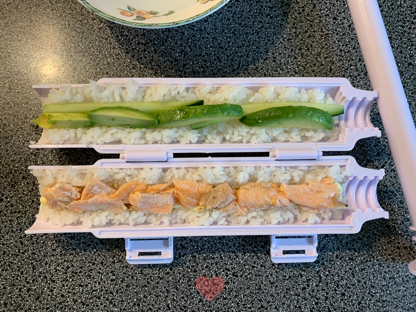 Terwijl Johan het keukenblokje in elkaar zet, maak ik in de keuken sushirollen voor vanavond. Ik maak ze zoals altijd met behulp van de sushi bazooka, dan gaat supermakkelijk en snel! Omdat we zelf fan zijn verkopen we hem ook hier in onze webshop. PS De baksteenmal hieronder op de foto waar ik mijn olijfolie en dergelijke in bewaar is trouwens ook weer verkrijgbaar in de shop! De sushirijst maak ik altijd op dezelfde manier. Van 500 gram sushirijst maak ik exact 6 rollen in de sushi bazooka. Reken als avondeten op circa 1,5 tot 2 rollen sushi per persoon. Ik maakte dit keer 6 dezelfde rollen en vulde ze met zalm (2 zalmfilets bestrooid met zout en peper en nét gegaard in de oven op 150 graden), komkommer en avocado. Verder doe ik ook altijd wat sesamzaadjes en een drizzle Kewpie mayonaise in de sushirol. Op de foto hieronder liggen die onder de zalm dus je ziet ze niet. Als ik de sushirol gemaakt heb in de bazooka, rol ik hem in een vel nori en daarna wikkel ik de rol strak (als een toffee) in vershoudfolie en leg hem in de koelkast om op te stijven.
