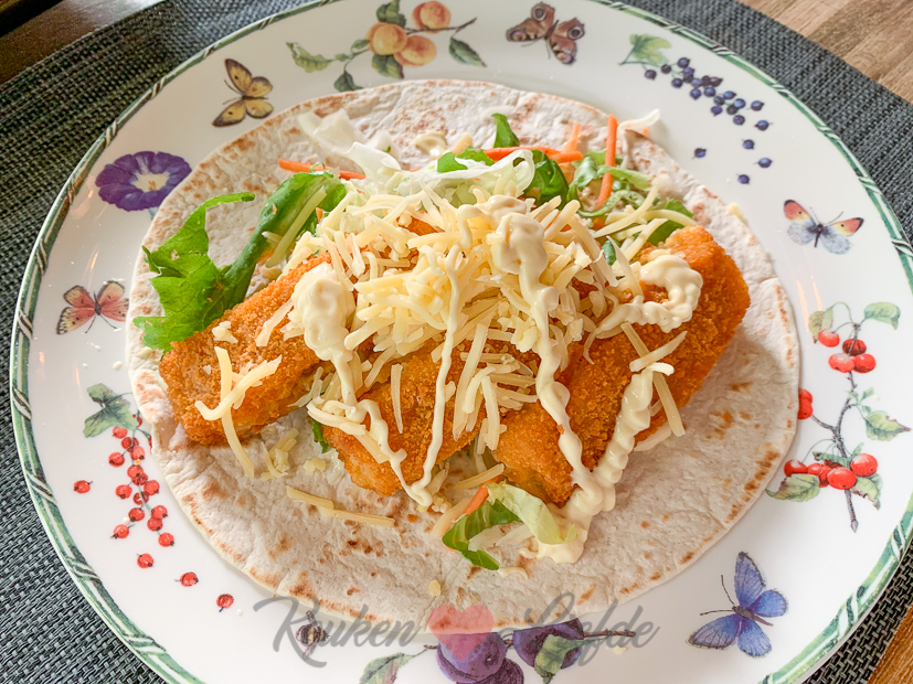 ’s Avonds eten we makkelijk en lekker: wraps met vissticks en salade.