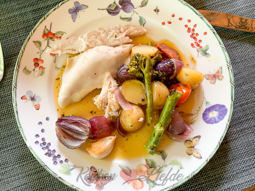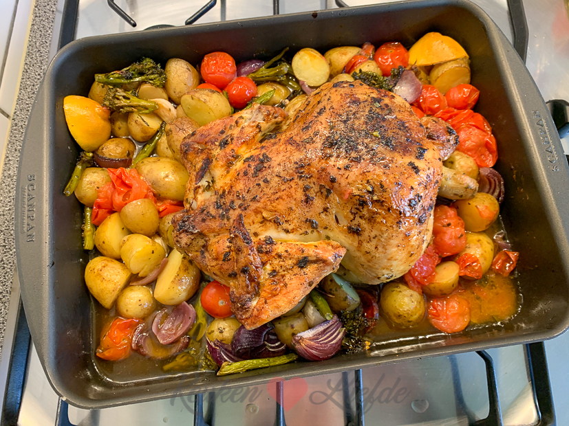 ’s Avonds kookt Johan en maakt een hele kip met krieltjes en groenten uit de oven. Was heerlijk!