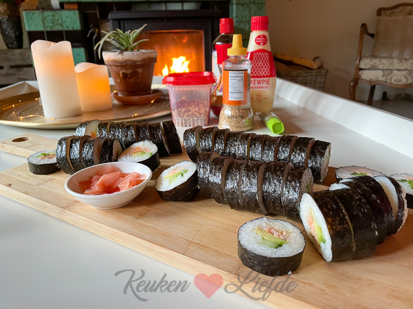 ’s Avonds steken we de houtkachel aan, kijken het Songfestival en smullen van de sushi. De sushi serveren we met ingelegde gember, wasabi, sojasaus en gefrituurde uitjes.