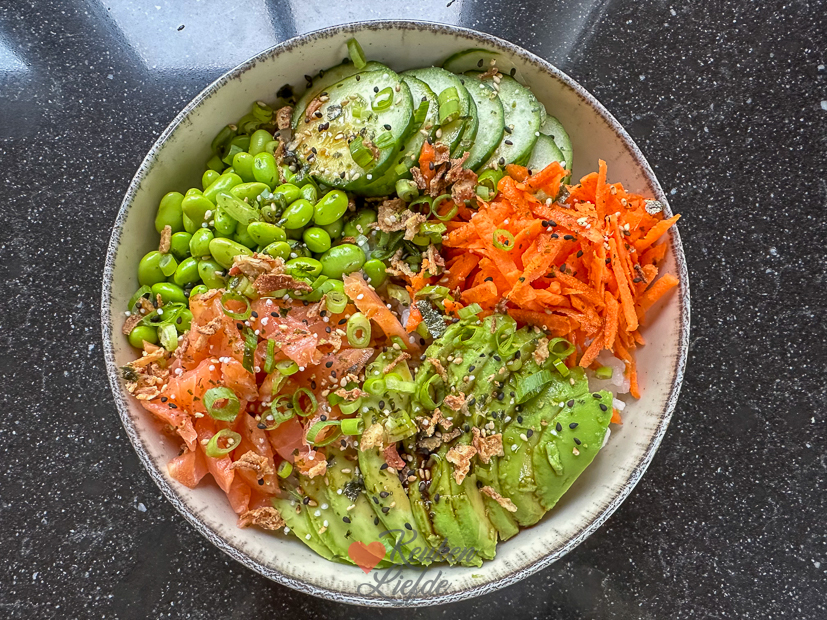 Vandaag krijg ik ook weer leuke foodpost binnen. We krijgen de sparerib kruiden en barbecue saus van NOSKOS binnen die we besteld hadden omdat we van het weekend spareribs gaan eten. En verder krijg ik ingeblikte vis en twee mooie kookboeken opgestuurd van Fish Tales en drie plantaardige dranken van Alpro. Verwennerij! Johan is vandaag op de beurs in de België en eet onderweg naar huis. Als ik aan Ella vraag wat ze ’s avonds wil eten hoeft ze geen seconde na te denken. “Sushi bowl!” En zo geschiedde. Het recept van de sushi bowl is ongeveer gelijk aan dit recept.