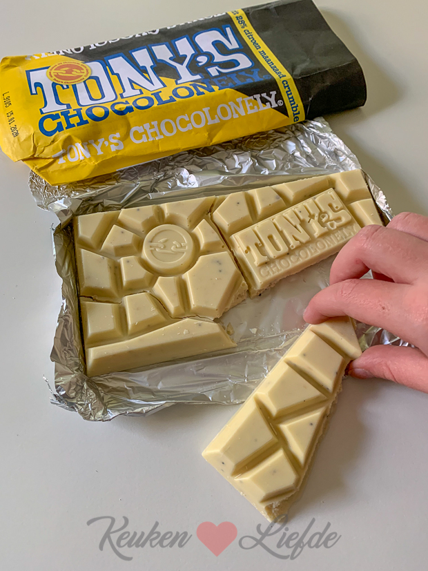 ’s Middags haal ik deze Tony’s Chocolonely reep uit de brievenbus. Een nieuwe, zomerse estafettereep van witte chocolade met citroen, maanzaad en crumble. Ik houd niet zo van witte chocolade omdat die meestal mierzoet is maar deze is lékker! Verslavend lekker…