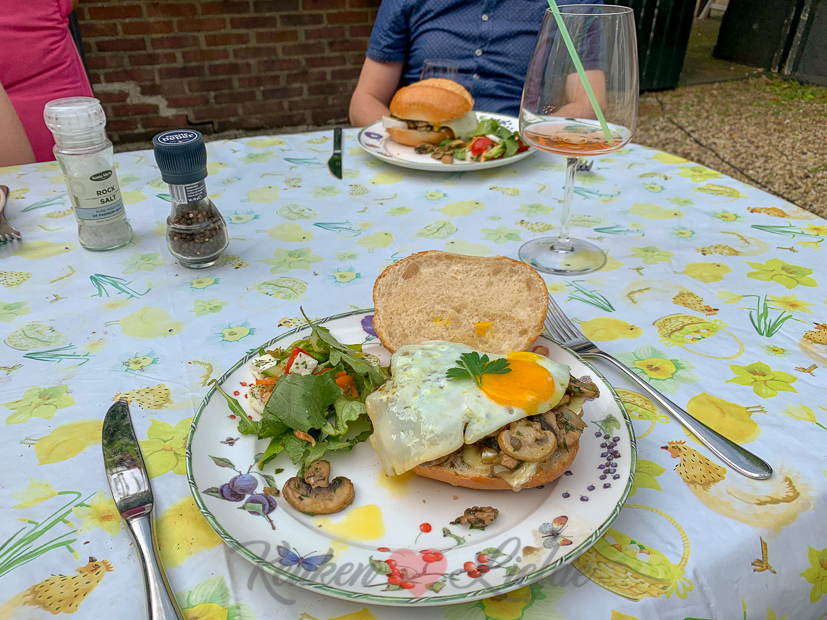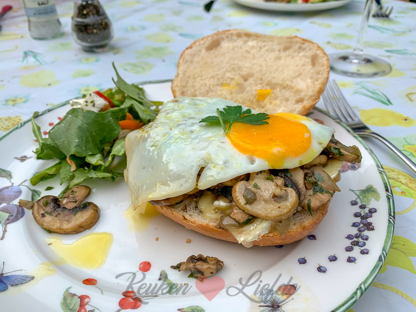 ’s Avonds als we thuis zijn maakt Johan een simpel en lekker avondmaaltje. Hij bakt wat champignons en eieren en serveert die op een knapperig Duits broodje. Mmmm…