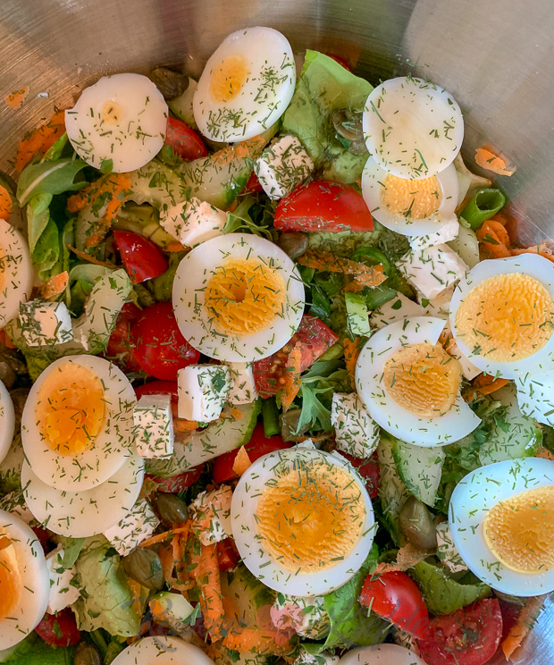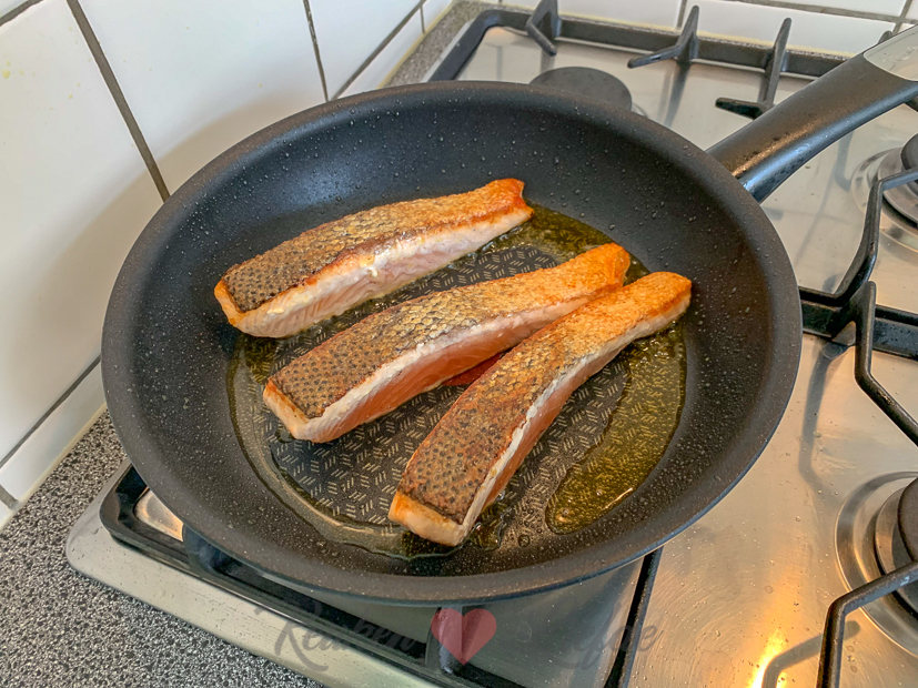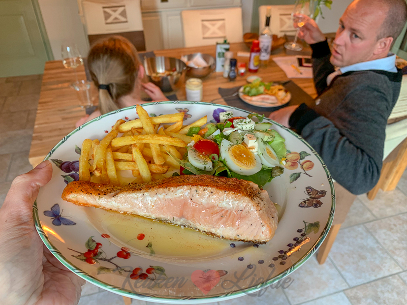 Er is nog lasagne over van gisteren maar ik vind het nooit lekker om twee dagen achter elkaar hetzelfde te eten. (Verwend nest hoor ik mijn moeder nu denken.) ? Ik heb geen idee wat we moeten eten, maar tijdens het boodschappen zie ik drie mooie zalmfilets liggen en besluit dat die het gaan worden. Met een lekkere kropsla-salade uit eigen moestuin en wat Franse frietjes uit de airfryer. Smullen weer!