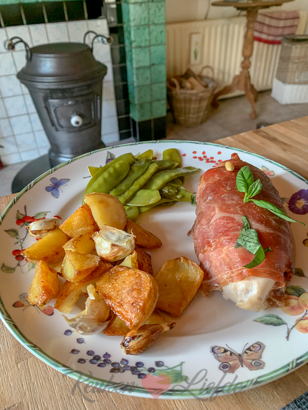 De gevulde kipfilet is ons avondeten. Erbij gesmoorde peultjes en geroosterde aardappels uit de oven.