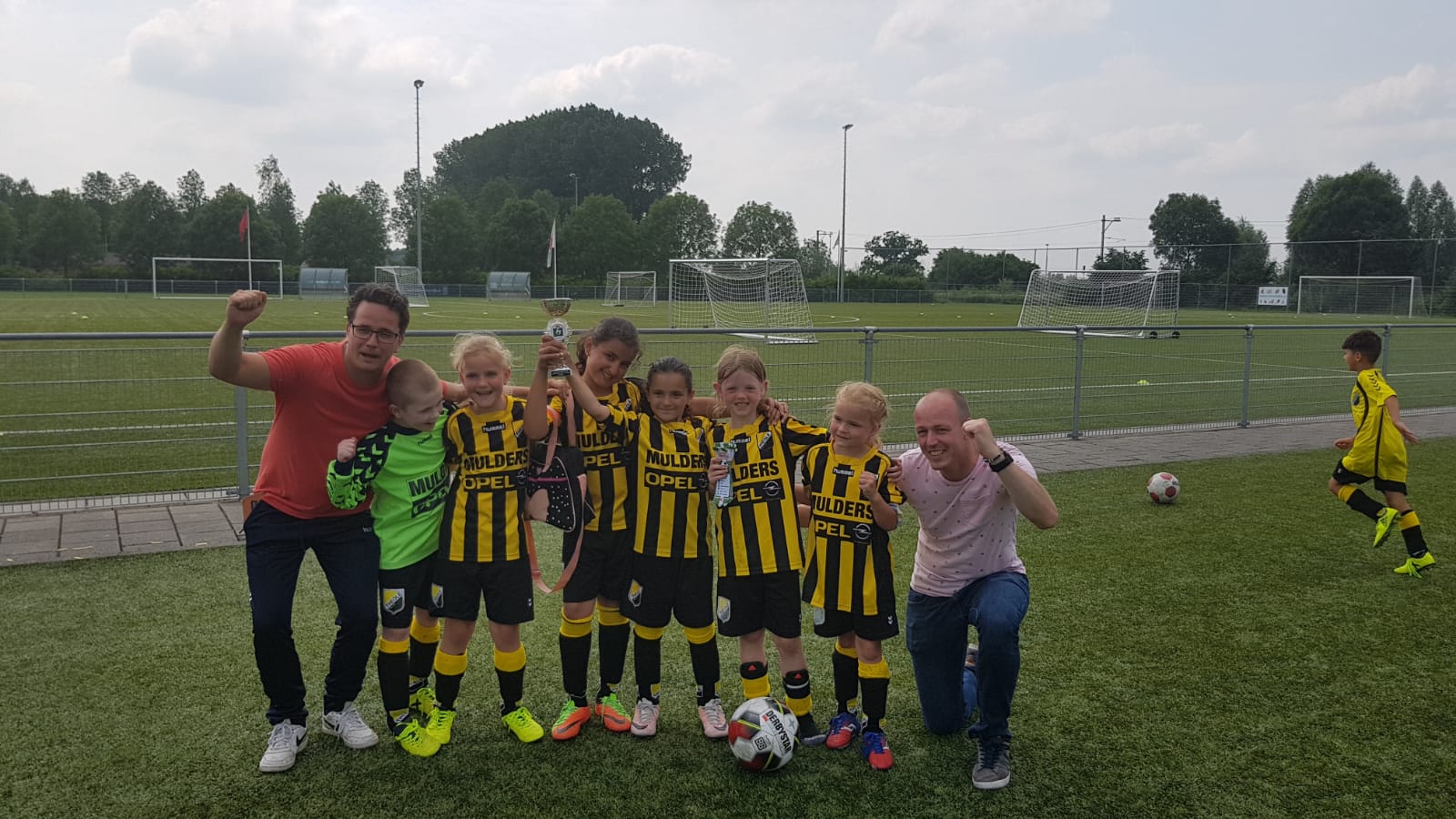 Als ik klaar ben haast ik me naar het voetbalveld en kan ik de laatste twee wedstrijden zien. De eerste drie wedstrijden winnen ze, maar de laatste wedstrijd verliezen ze met 4-2. Jammer, maar tweede worden in je poule is nog steeds supergoed!