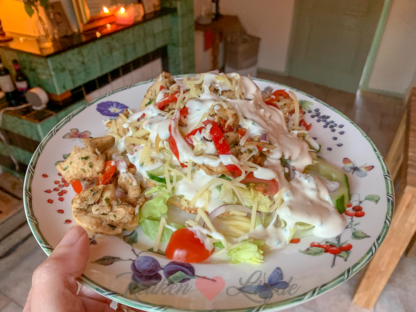 Ella-Marie is doodmoe en heeft ’s avonds ook niet zoveel honger meer. Johan maakt een plankje met wat lekkere, kleine hapjes voor haar klaar en daarna gaat ze lekker naar bed. Johan en ik eten een Turks afbakbroodje met zelfgemaakte kipkebab (fijngesneden kipfilet gemarineerd in deze zelfgemaakte kebabkruiden) die ik bak met paprika en ui. Erbij ijsbergsla, rode ui, komkommer, tomaat, geraspte kaas en zelfgemaakte knoflooksaus. De knoflooksaus maak ik door half mayonaise, half Turkse yoghurt, 1 teentje uitgeperste knoflook, veel verse bieslook en zwarte peper door elkaar te roeren. We eten het op de bank en kijken ondertussen naar F1 en voetbal.