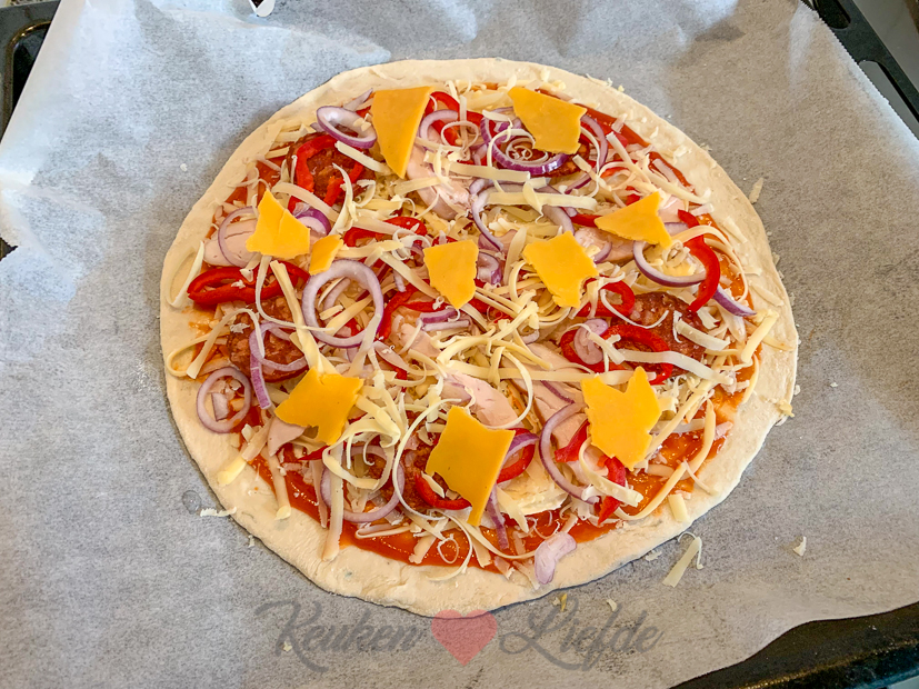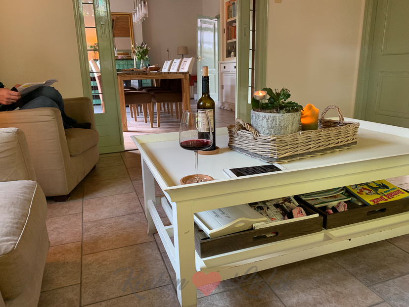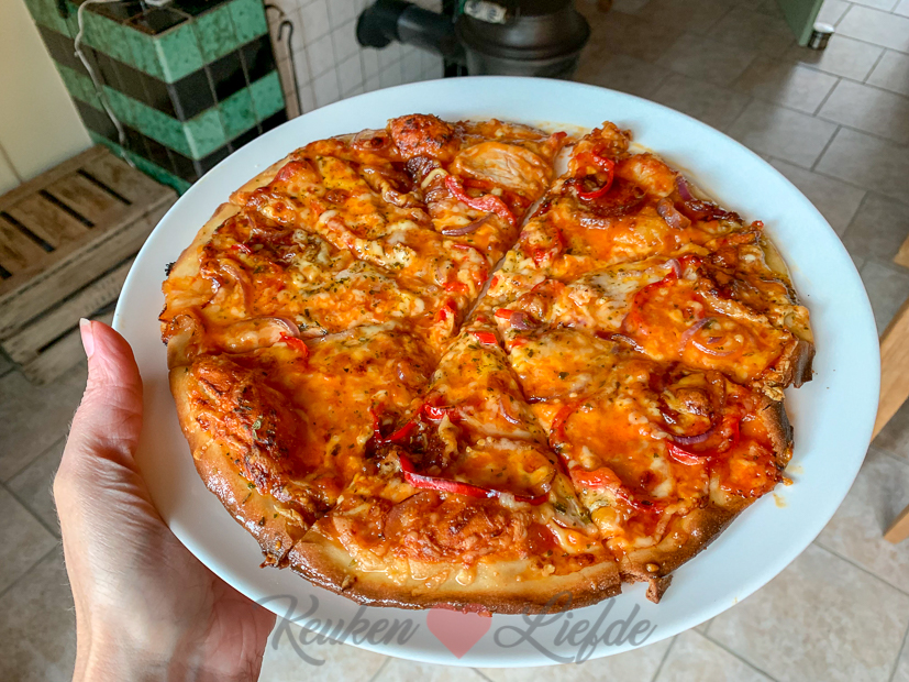 Als we thuiskomen schenken we een glas wijn in en gaan even zitten. Daarna maken we samen zelfgemaakte pizza (het pizzadeeg had ik eerder al gemaakt) en kijken voetbal.