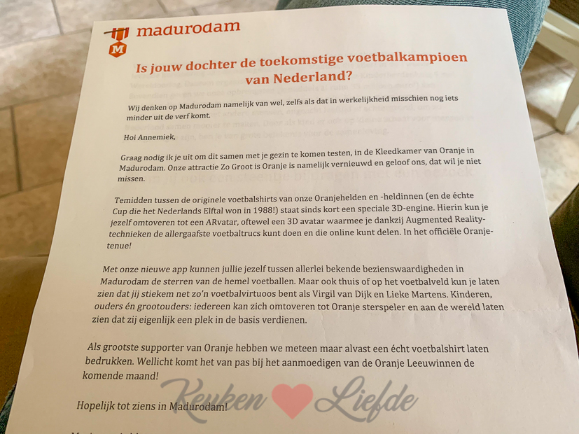 We worden nog meer verwend. Van Madurodam krijgen we vier entreekaarten voor het park en een oranjeshirt met de naam van hun nieuwe attractie erop, Zo Groot Is Oranje. Superleuk! Ella-Marie is nog nooit in Madurodam geweest en voor Johan en mij is het ook al heel lang geleden. Heel veel zin in dus!