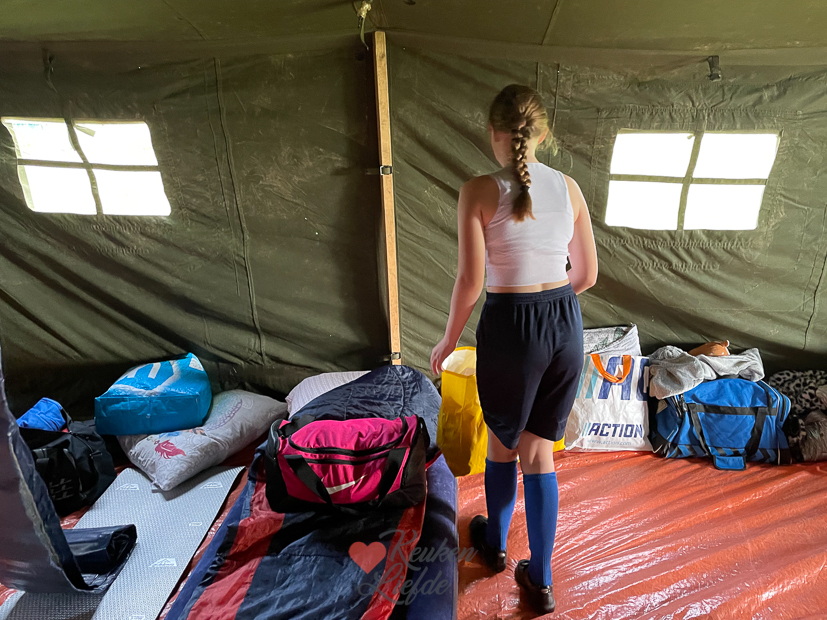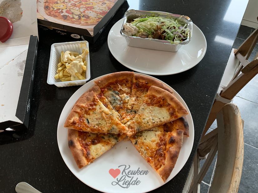 Het is Eerste Pinkersdag. Johan is om half negen op de voetbalclub om te helpen met spelactiviteiten voor het kamp. Ondertussen ben ik thuis op kantoor bezig met wat KL-dingen. Eind van de ochtend fiets ik ook naar het voetbalveld om de laatste partijtjes te kijken. In verband met het voorspelde slechte weer op komst waren alle kampactiviteiten naar voren geschoven en bleef het tot het einde gelukkig droog. Ella had het superleuk gehad en was veel mooie herinneringen en een paar dikke wallen rijker. Eenmaal thuis moest ze van ons eerst gaan douchen maar als het boven verdacht lang blijft gaan we toch maar even kijken. We treffen haar slapend op bed aan. Haha! Ondertussen maakte ik van de gelegenheid gebruik om de kelder een grote opruiming te geven. Ik kan nu weer planken zien en alles wat erop staat is houdbaar. Jottem! ’s Avonds zou ik eigenlijk koken maar uiteindelijk hadden we allemaal meer zin in Thuisbezorgd. Ik vat het maar niet persoonlijk op. Ella en ik bestelden een pizza quattro formaggi en deelden samen een klein frietje met en Johan ging voor een kebabschotel. We aten het voor de tv op.