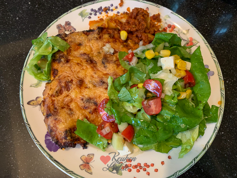 Het is weer een gewone werk- en schooldag als altijd. Johan en Ella-Marie zijn vroeg de deur uit en ik werk weer thuis op kantoor. Op dinsdag heb ik altijd mijn vaste kantoordag en werk ik onder andere dit Kijkje in de keuken uit dat daarna direct online komt. Ik hoef niet te koken vandaag want er zijn nog verschillende kliekjes eten in de koelkast. Omdat er overal nog maar kleine beetjes van zijn, eet iedereen ’s avonds iets anders. Ik maak met het allerlaatste kliekje bolognese- en bechamelsaus nog een kleine portie lasagne voor mezelf en maak er een salade bij. Heb gruwelijk zitten smullen.