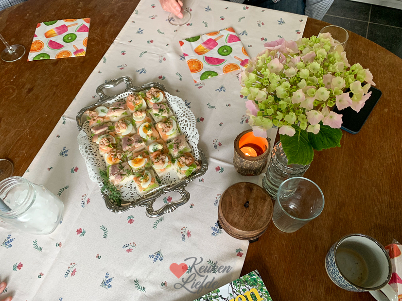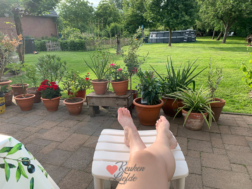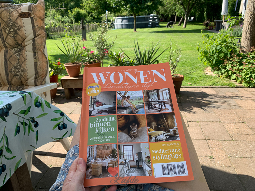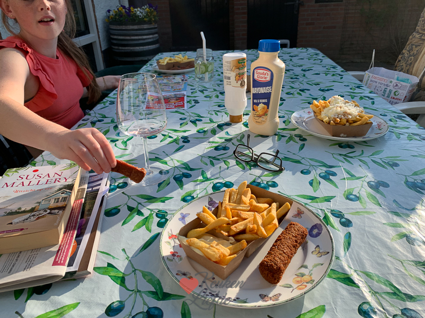 Als ik ’s ochtends in de keuken sta om brood te smeren en uit het raam kijk, zitten er twee katten naar binnen te staren. Puk en Marie kunnen middels de chip in hun nek zelf door het kattenluikje de schuur in en uit en slapen en eten daar. Als het buiten koud is of de hele dag regent komen ze graag naar binnen, maar vandaag is het mooi weer en laat ik ze buiten. Ik sta vandaag weer in de keuken om een paar recepten voor de website te maken en dan wil ik zowieso geen katten binnen. Ze zijn niet te vertrouwen… Aan het eind van de middag geniet ik buiten nog even van het zonnetje met de nieuwe Wonen Landelijke Stijl. Ondanks mijn kookdag heb ik ’s avonds niks in huis voor het avondeten en omdat ik geen zin meer heb om boodschappen te doen en weer te koken, halen we een frietje. Ik neem bijna altijd hetzelfde: een klein frietje met en een kroket. Johan neemt bijna altijd een frietje catamaran en Ella neemt altijd een kleine frietje met en varieert met de snacks. Dit keer nam ze een Mexicano. Het is een prachtige avond dus na het eten wordt er nog even in de tuin gewerkt. De moestuin ligt er netjes bij. Net zoals andere jaren hebben we sla, radijs, pastinaak (voor het eerst), pompoen, sperziebonen, rabarbar, rucola, tomaten en courgettes. Alleen het komkommerplantje dat we hadden gepoot is overleden, de rest groeit als kool.