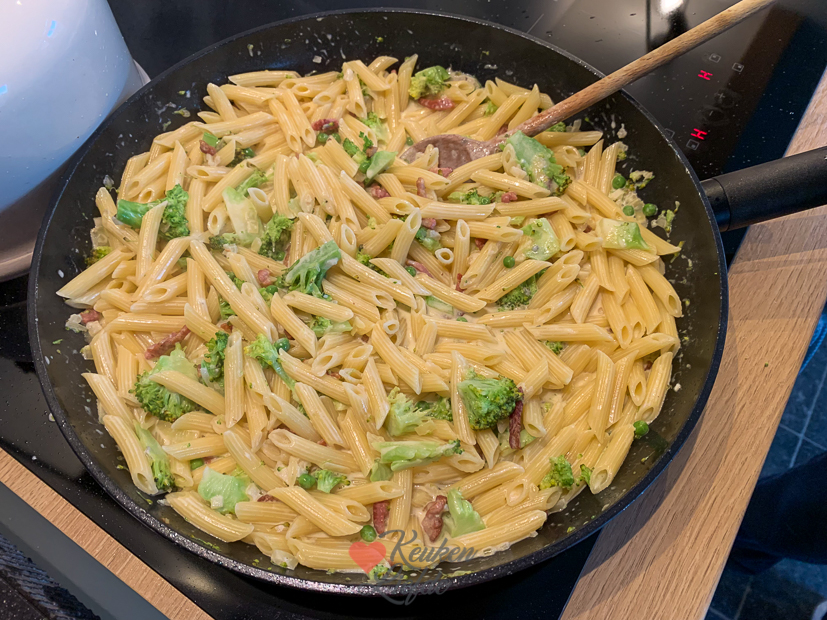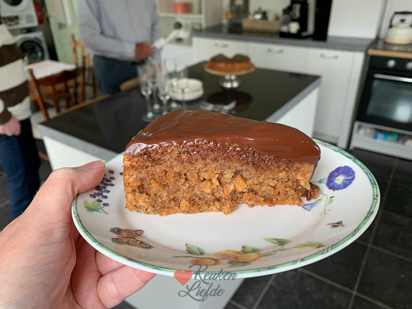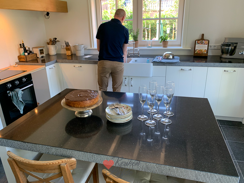 Tweede Pinksterdag. Ik sta al vroeg in de keuken om taart te bakken. Mijn ouders en broers komen begin van de middag even op de koffie en bij de nieuwe keuken kijken. Ik had taart bij de koffie beloofd en in het kookboek La vita è dolce had ik een lekker recept gezien dat ik wilde uitproberen: een notentaart met chocoladeglazuur. De taart zag er prachtig uit dus maakte ik er snel nog een paar foto’s van voordat de visite kwam. Ondertussen dat ik taart aan het bakken was, maakte mini me warme havermoutpap voor zichzelf als ontbijt. Tijdens een speurtocht door de kelder had ze een pak havermout zien staan (net een schatkist zo’n opgeruimde kelder) en toen ik haar vertelde dat je daar warme ontbijtpap mee kunt maken wilde ze dat uitproberen. Afgetopt met stukjes appel en kaneel een appetijtelijk ontbijt, maar helemaal om is ze nog niet. (Ik kan er ook nog steeds niet aan wennen.) De taart was wel een groot succes dus het recept ga ik met jullie delen. Moeders had nog haar befaamde vishapjes gemaakt en meegenomen die die kwamen na de koffie en taart ook nog op tafel met een glaasje bubbels erbij. ’s Avonds maakte ik pasta voor het avondeten met spekjes, broccoli en roomsaus. Volgens Johan was het de lekkerste pasta die ik sinds lange tijd maakte. Pardon?! Recept is simpel. Voor 3 personen: 125 g spekreepjes langaam uitbakken tot goudbruin in grote koekenpan. Dan 1 gesnipperde ui erbij en kort meefruiten. Ondertussen 300 – 350 g penne beetgaar koken in pan. Mok pastakookvocht uit de pan scheppen en opzij zetten. Dan 2 uitgeperste knoflooktjes, 1 (kleine) fijngesneden broccoli en verkruimelde kippenbouillontablet erbij en even meebakken. Scheutje pastakookvocht (niet alles) erbij en zachtjes koken tot broccoli beetgaar is (ik gooide er ook nog een hand diepvriesdoperwten bij toen de broccoli bijna gaar was). Afblussen met 250 ml slagroom, 125 g crème fraîche, handje geraspte parmezaan, klontje roomboter (en optioneel stukje gorgonzola) erbij en goed doorwarmen tot kaas en boter gesmolten zijn. Eventueel extra kookvocht toevoegen als de saus te dik of te zout is. Dan pasta afgieten en door de saus roeren. Smakelijk.