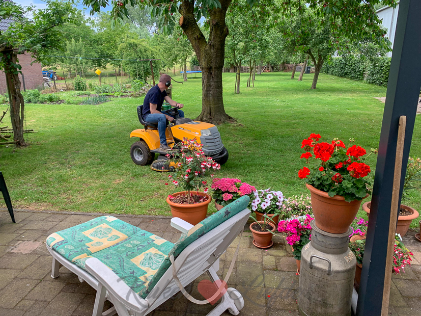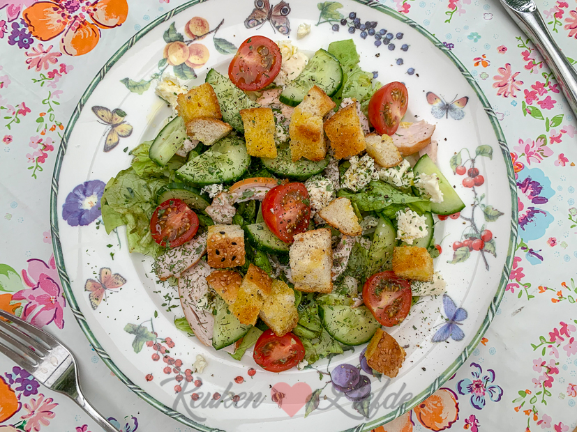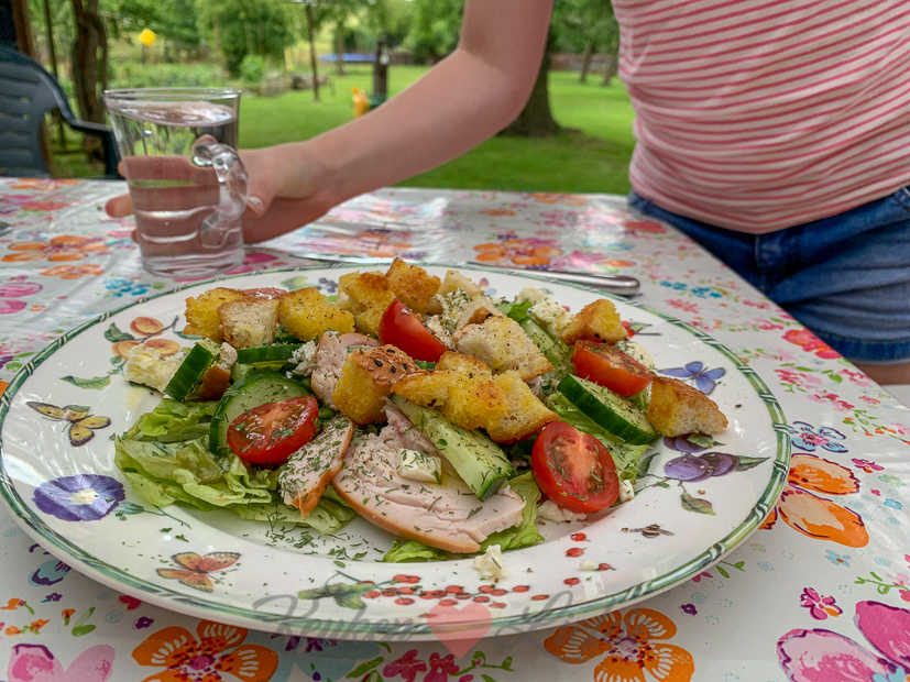 De week begint met een doodnormale school- en werkdag. Als Johan thuiskomt maait hij het gras. Dat moet nu weer twee keer in de week. Voordat Ella-Marie ’s avonds moet voetballen maak ik een lekkere salade voor haar klaar met restjes uit de koelkast: sla uit eigen moestuin, komkommer, tomaat, gebakken croutons van een restje brood, feta en gerookte kip.