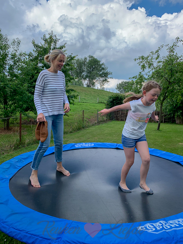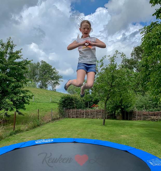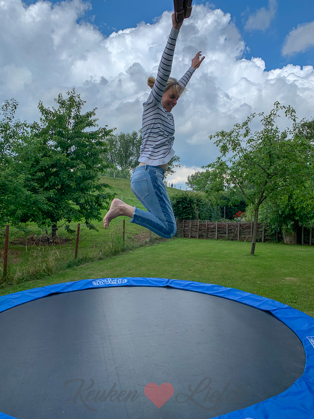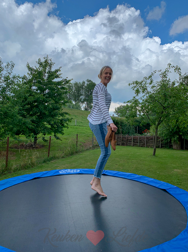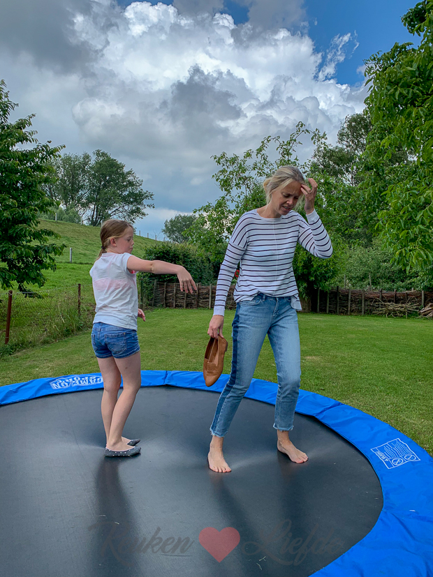 We beginnen de dag met een sprongetje op de trampoline. De zomer komt eraan (lees: bikini’s en korte rokjes!) en ik heb ergens gelezen dat je met trampolinespringen heel veel calorieën verbrand. Dussss…. Wat vind je trouwens van mijn cognac kleurige loafers in lizzard leer? Ik bestelde ze online bij Sacha en vind ze superleuk! Ik vind het altijd lastig om de juiste schoenen te vinden onder een outfit, maar deze passen bijna overal onder en ze zitten ook nog eens heerlijk. Johan vind loafers altijd tuttig staan (volgens mij ziet hij me het liefst de hele dag op hoge pumps!) terwijl Ella-Marie ze juist leuk vindt… Benieuwd, wat zijn jouw favoriete schoenen om in de zomer te dragen als je casual gekleed bent en geen sandalen of slippers aan wilt?