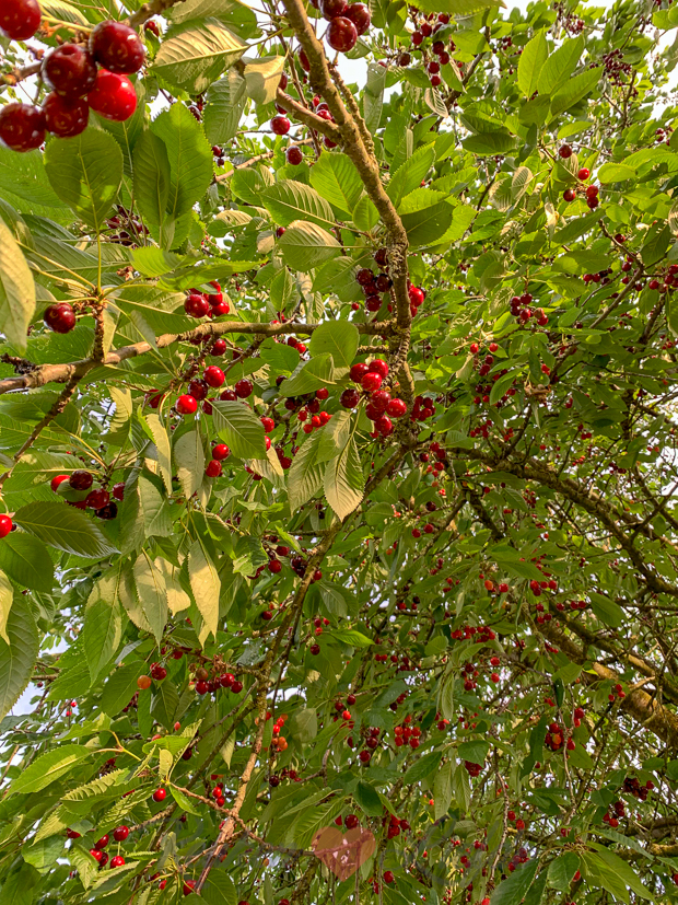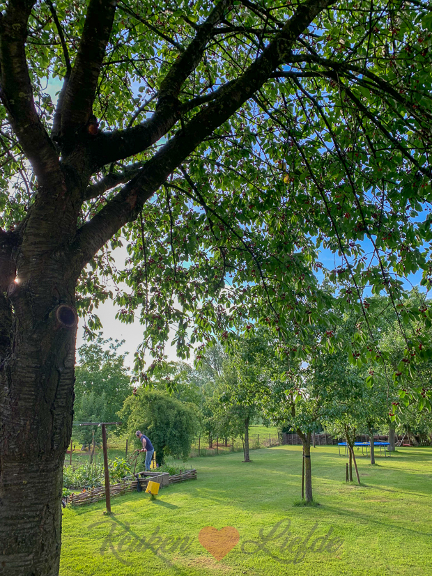 In onze achtertuin staat een grote kersenboom die op dit moment uitpuilt van de rijpe kersen. Jammer alleen dat we er zo moeilijk bij kunnen komen… ??♀️?Gelukkig kunnen we genoeg kersen plukken van de laaghangende takken of we rapen ze op.