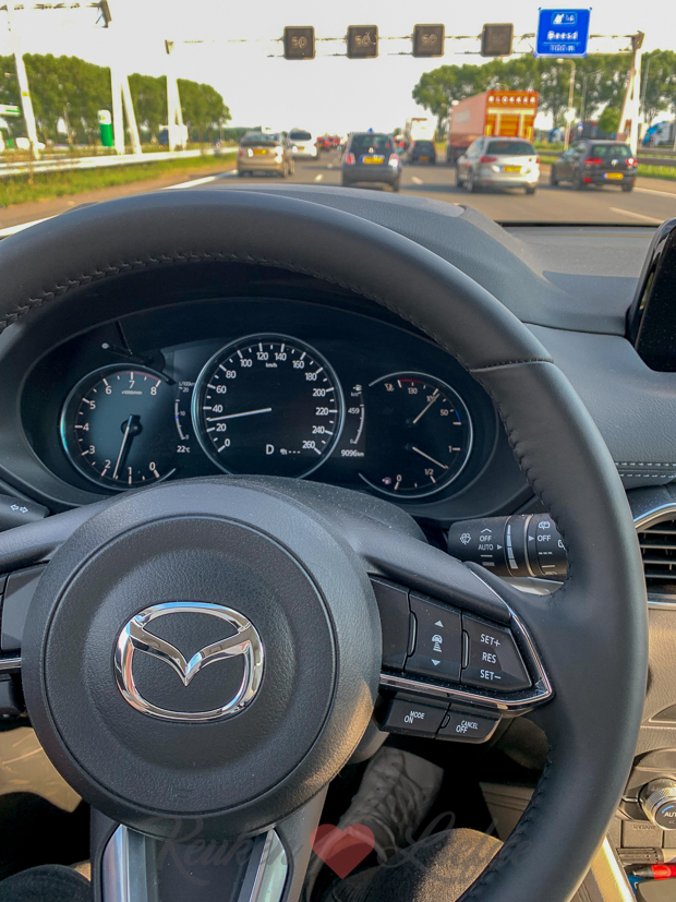 Omstreeks zes uur ’s avonds rijd ik weer weg uit Amersfoort en natuurlijk kan ik dan aansluiten… Pfffff, zo blij dat ik dit niet elke dag hoef! Al moet ik wel zeggen dat filerijden in de CX-5 veel minder vermoeiend is dan in mijn oude schakelbak. Dankzij de radar cruise control kun je een bepaalde snelheid instellen en houdt de auto zelf een veilige afstand op zijn voorligger. Je hoeft dus alleen maar je handen aan het stuur te houden!
