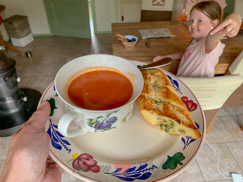Vandaag staat er een simpele kom tomatensoep (uit een pak dit keer) met stokbrood en kruidenboter op het menu. Lekker!