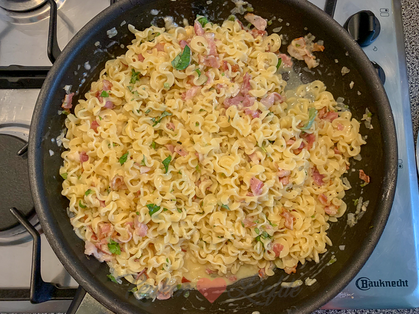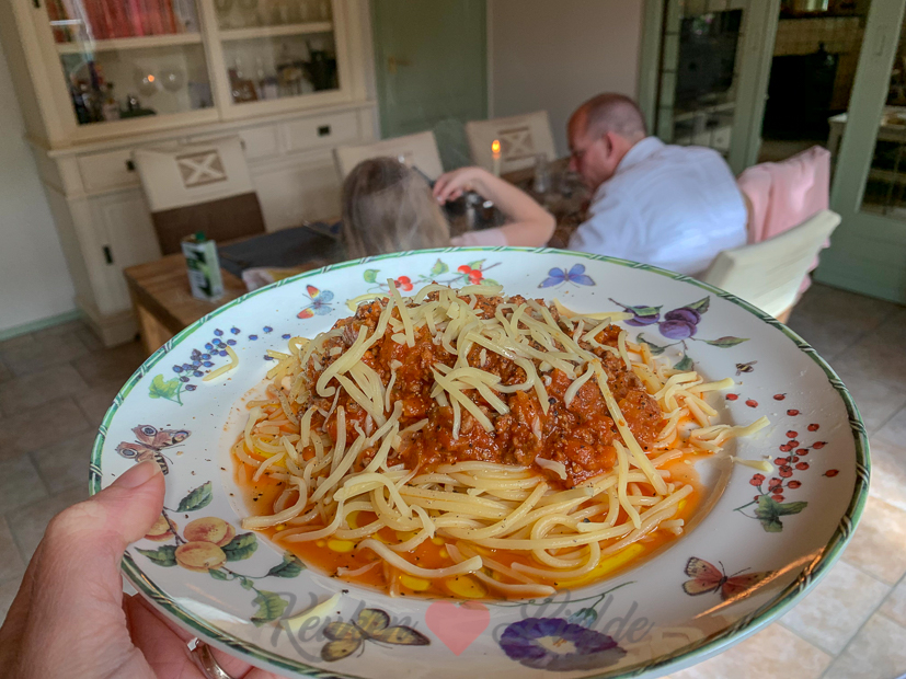 Johan en ik eten zelfgemaakte pasta carbonara. Pasta, spek, eieren en kaas; ook die ingrediënten heb ik altijd in huis. De pasta kocht ik in Duitsland toe wij daar boodschappen deden. In Duitsland hebben ze altijd veel leukere pastavormen dan hier in Nederland vind ik. Deze pasta was een perfecte match met de carbonarasaus.