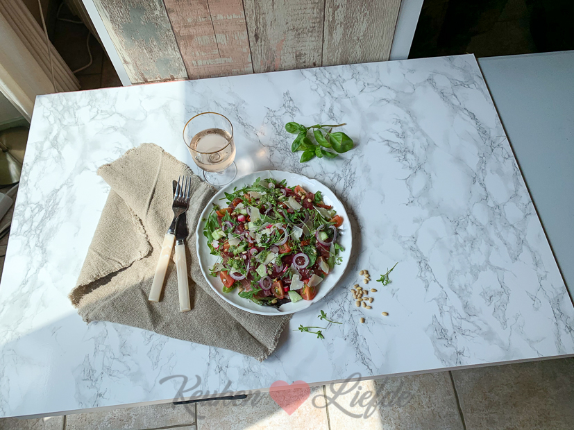 ’s Avonds eten we de carpacciosalade met pestodressing die ik vanmiddag maakte voor KL. Met wat stokbrood erbij een heerlijke en makkelijke maaltijd!