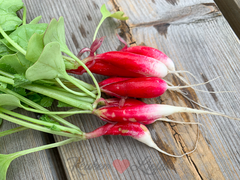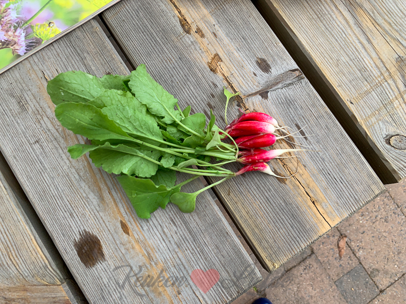 Ik trek een paar radijsjes uit de moestuin om op te snoepen. Ik hou van radijsjes! Wist je trouwens dat radijsjes uit eigen moestuin veel pittiger smaken dan radijsjes uit de supermarkt?
