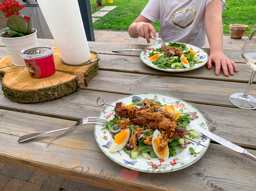 Een nieuwe week begint. Ella-Marie is naar school en Johan is naar zijn werk. Ik werk een dagje op kantoor. ’s Avonds grillen we varkenshaassateetjes op de barbecue en leggen die bovenop een salade. Makkelijk en heerlijk!