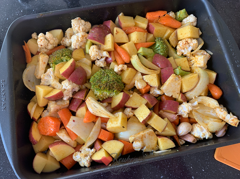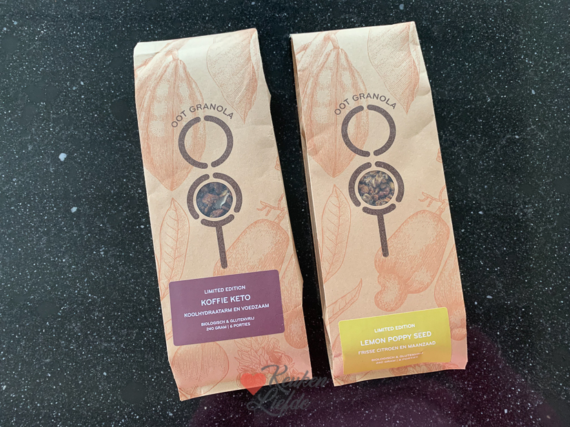 Het is weer een gewone dinsdag als altijd. Als Johan en Ella-Marie de deur uit zijn maak ik een cappuccino voor mezelf en ga ik op kantoor achter de computer zitten. Mails beantwoorden, social media inplannen, recepten uitschrijven en het Kijkje in de keuken afmaken en online zetten. ’s Middags krijg ik een pakketje thuisbezorgd met twee limited editions granola van OOT. Ik vind ze allebei lekker. De granola’s van OOT zijn biologisch, suikerarm en ze passen gewoon door je brievenbus (onder de 4 zakken). Superhandig. Hoewel ik eigenlijk niet zo’n ontbijter ben, is yoghurt met deze granola wel echt een traktatie. Aanrader dus! Terwijl ik ’s avonds voor het avondeten aan de slag ga, gaat Johan nog even de zijtuin in om onkruid te wieden. Voor het eten vulde ik een grote braadslee met groenten en aardappel om te roosteren in de oven. De laatste 10 minuten legde ik een groot stuk zalm bovenop om mee te garen. Supersimpel en lekker.