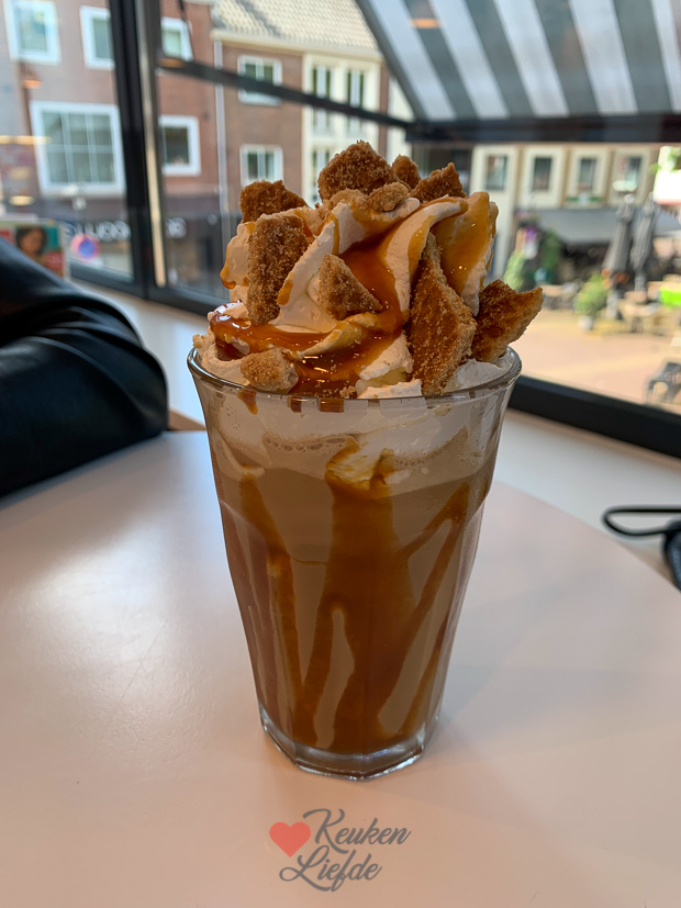 Halverwege de ochtend haal ik Ella op school op want we hebben een afspraak voor haar bij de orthodontist in Tiel. Ze krijgt waarschijnlijk een blokjesbeugel aangemeten. Na de afspraak (en bevestiging dat ze idd een beugel krijgt) is het lunchtijd en besluiten we even een broodje Surinaamse kip te eten bij de Hema. Een medewerker van de Hema had net een grote ijskoffie met slagroom, stroopwafel en karamelsaus op de foto gezet en vroeg of wij hem wilden opdrinken. Daar zeggen wij natuurlijk geen nee tegen. 😀 Wel erg machtig hoor, we kregen hem lang niet op helaas. Daarna snel weer met de pont de Waal overgestoken en Ella terug naar school gebracht. Weer thuis dook ik de keuken in om nog een paar recepten voor de website te maken. Daarna snel de wc in om de boel lichtjes te schuren en stofvrij te maken.