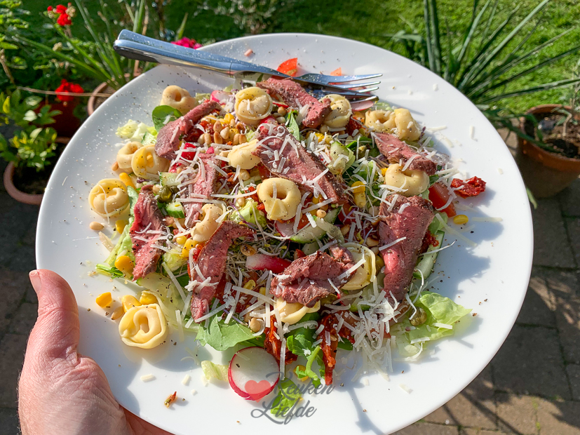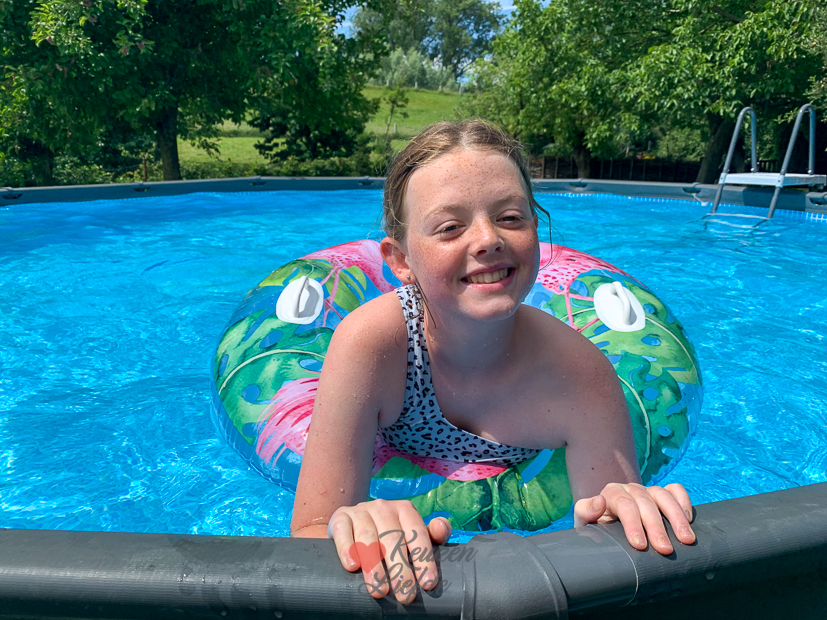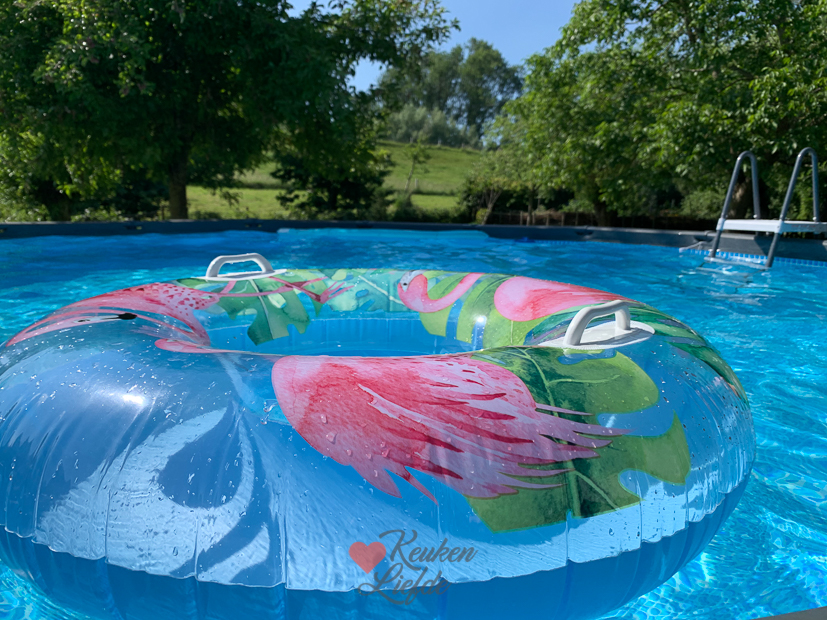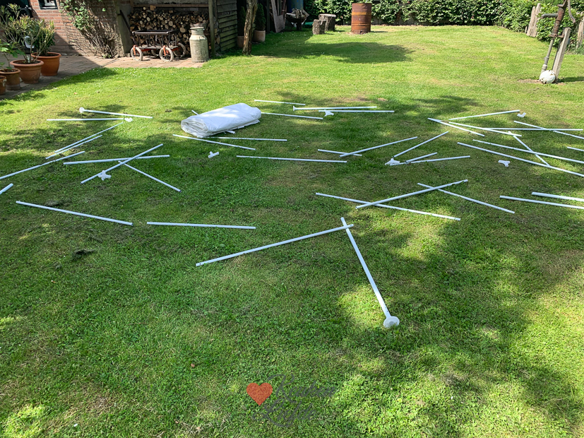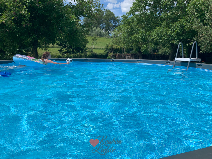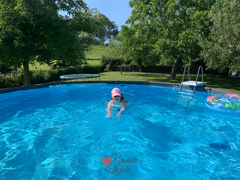 Johan is al vroeg opgestaan. Ella en ik slapen lekker uit. Als ik beneden kom zie ik dat Johan buiten al druk bezig is. We hadden onlangs bij de Action een partytent gekocht (altijd handig om te hebben) en Johan had hem opgezet om te controleren of hij compleet was. Als ik buiten kom heeft hij hem alweer afgebroken. Hij was compleet gelukkig en makkelijk op te zetten. De rest van de zondag genieten we van het mooie weer, wordt er gezwommen (alleen door Ella, Johan en ik vinden het water nog echt te koud) en zet ik de eerste laag projectverf op de wc. Ella wilt ook graag verven dus mag ook een paar baantjes rollen. ’s Avonds eten we nog een keer salade met biefstuk van de barbecue. Dit keer zonder kaastortellini maar met zelfgemaakte frietjes uit de frituur. Smullen!