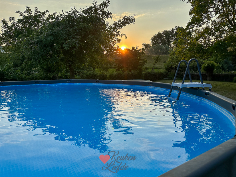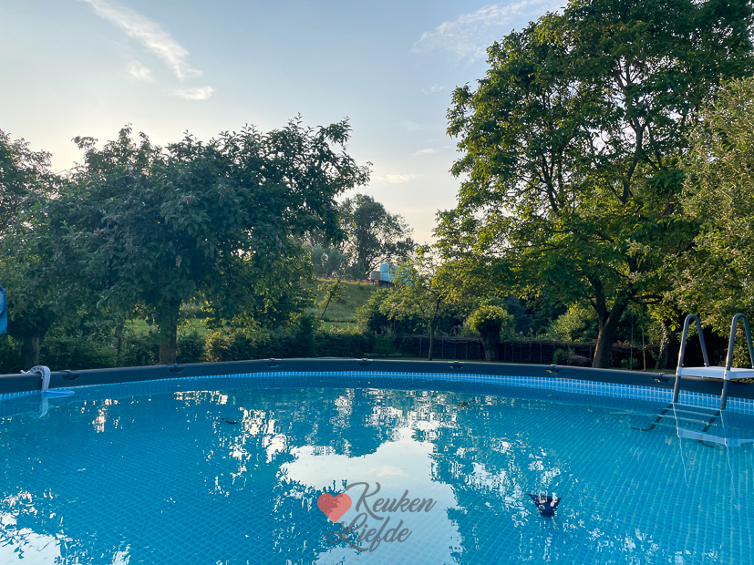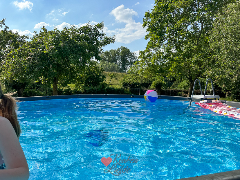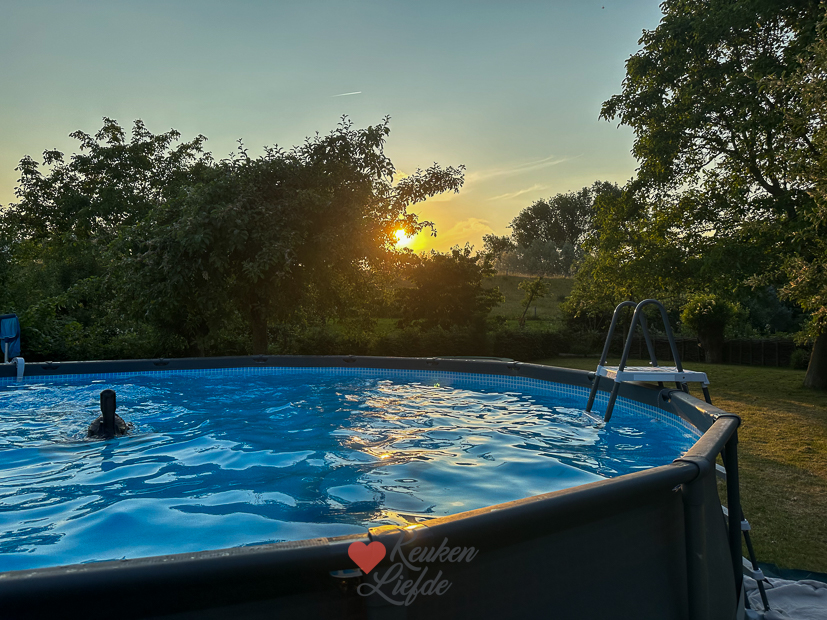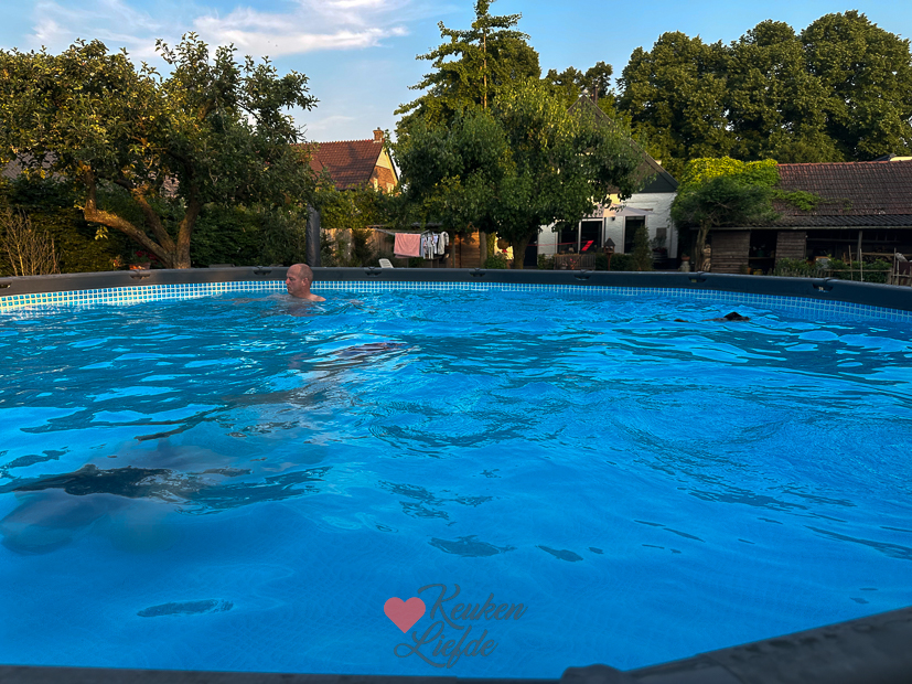 Vaste prik op zondagochtend: samen ontbijten. De rest van de dag deden we niet zoveel. Met 32 graden was ook veel te warm om je druk te maken. ’s Middags kwamen er vriendinnetjes van Ella zwemmen en ’s avonds aten we kip van het spit.