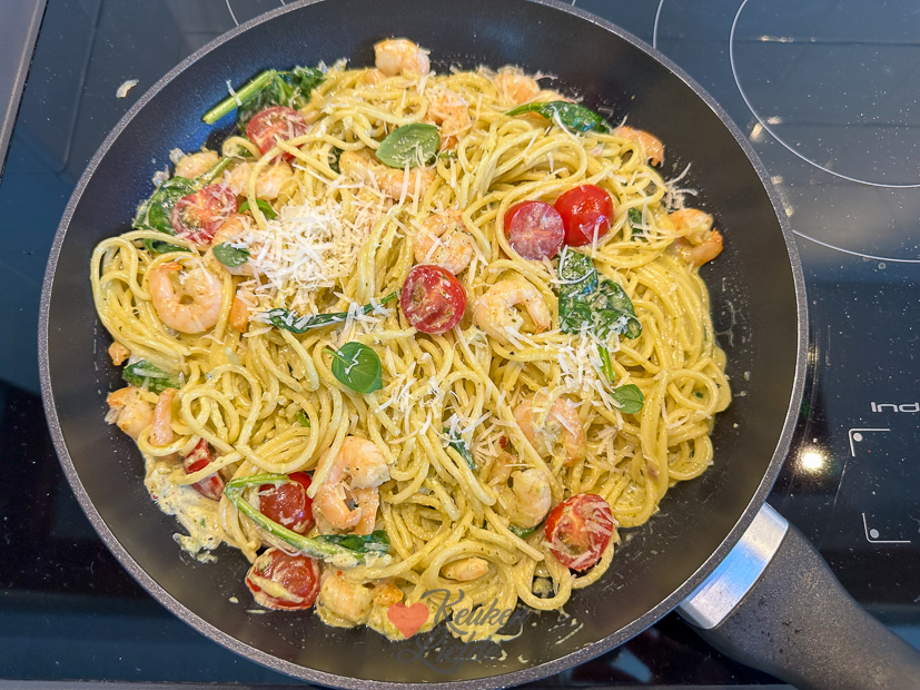 - Ik deelde een reels van deze spaghetti pesto met garnalen op onze IG en ook op de website deel ik het recept binnenkort.