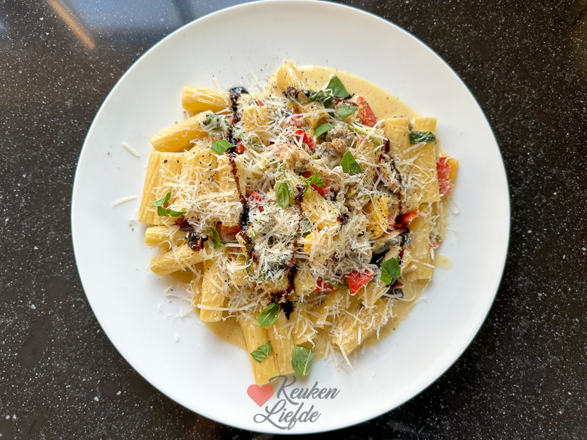 Vandaag en morgen werk ik thuis op kantoor. De recepten die ik heb gekookt moeten uitgewerkt worden en de foto’s moeten worden uitgezocht en eventueel bewerkt worden. Eind van de middag en ’s avonds zijn we buiten te vinden. Voor het avondeten maakte ik een makkelijke en snelle pasta met kliekjes uit de koelkast die op moesten. Zo uit mijn hoofd gingen er wat ui, knoflook, champignons, paprika, spinazie, spek, room, parmezaan en gorgonzola in. Was heerlijk.