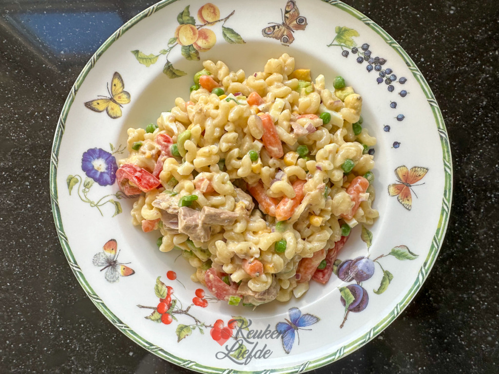 ’s Avonds eten we een lekkere macaronisalade met van alles dat we tegenkomen (o.a. een blikje tonijn, mais, tomaat, hardgekookt ei en wortel en doperwten uit de vriezer). Altijd lekker.