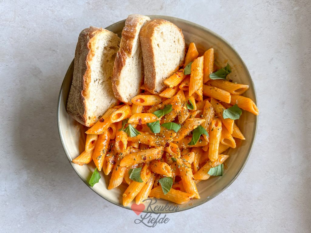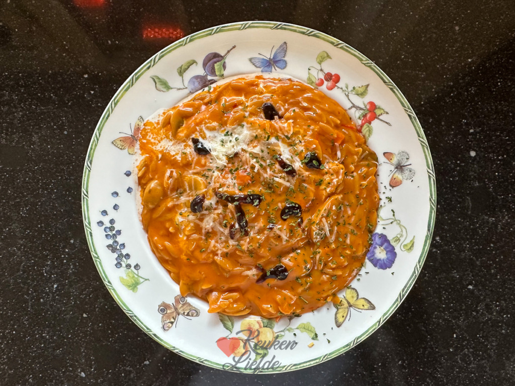 Johan en Ella zijn weer vroeg de deur uit en ik werk weer thuis op kantoor. Mijn moeder stuurt een foto door van haar lunch. Het mag duidelijk zijn waar de Keukenliefde vandaan komt. 😍 En Ella appt dat ze ’s avonds het eten wilt koken. Prima. Ze maakte de Gigi Hadid pasta en die was heerlijk! Dit recept alleen verving ze de wodka door citroensap.