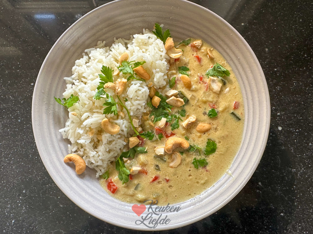 Recept? Je fruit eerst een uitje met wat knoflook aan, dan de in blokjes gesneden groente met een verkruimelde kippenbouillontablet erbij en even meebakken tot ze zacht zijn. Groene currypasta erbij (de Thaise groene currypasta van Fairtrade is erg lekker), kort meebakken en een blik kokosmelk erbij. Lege blik omschudden met scheut water en ook erbij. Zachtjes laten pruttelen. Ondertussen rijst koken en daarna lekker opscheppen. Wat cashewnoten en peterselie (of koriander) erover om het af te maken.
