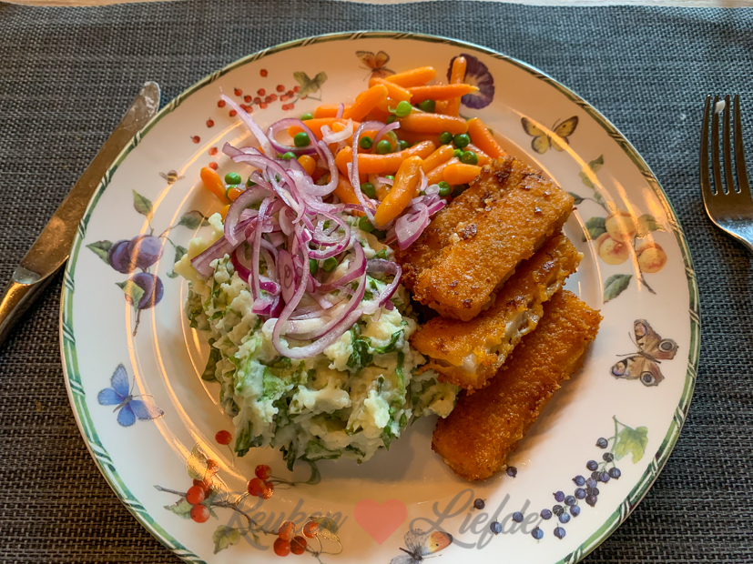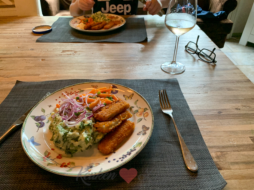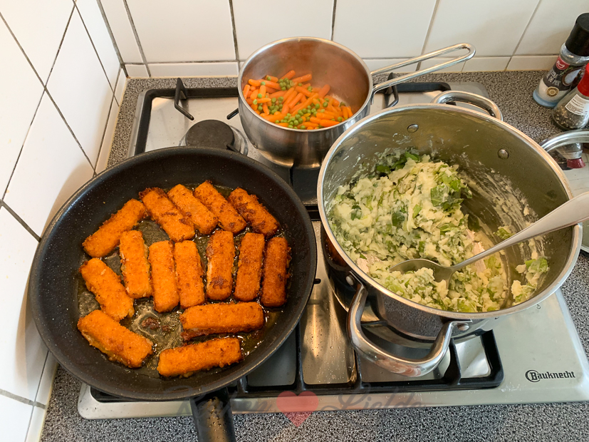 We hebben 6 kroppen botersla in de moestuin staan die klaar zijn om te oogsten. Volgend jaar moeten we dat toch maar eens even beter gaan plannen… Vandaag staat er dus kropsla op het menu. Verwerkt in een stamppot met erbij wortels en doperwten, zoetzure rode ui (gewoon gesneden rode ui even laten marineren in sushi-azijn. Geniaal lekker!) en vissticks. Heerlijk Hollands maaltje!