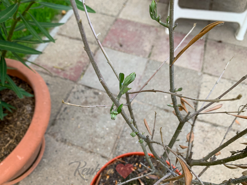 Dit olijvenboompje was overleden dacht ik, maar begint toch weer uit te lopen. Vreugdedansje toen ik deze groene blaadjes zag! ??
